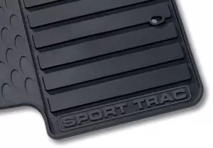 The deep grooves and raised ridges in these heavy-duty mats catch and hold snow- slush and mud- while protecting the vehicle carpeting. Driver-side and passenger-side mats have positive retention to help keep mats in place. Front mats have Sport Trac logo. Available in ebony- in 4-piece kits.